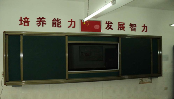 2. 外滑軌裝置:安裝兩塊移動綠板,兩綠板尺寸之和與內(nèi)軌道白板的尺寸一致;進(jìn)行常規(guī)教學(xué)時(shí),可將此綠板滑動到液晶電視前方,保護(hù)液晶觸摸一體機(jī),增大書寫面積;進(jìn)行多媒體教學(xué)時(shí),將綠板拉開,使用液晶觸摸一體機(jī)。